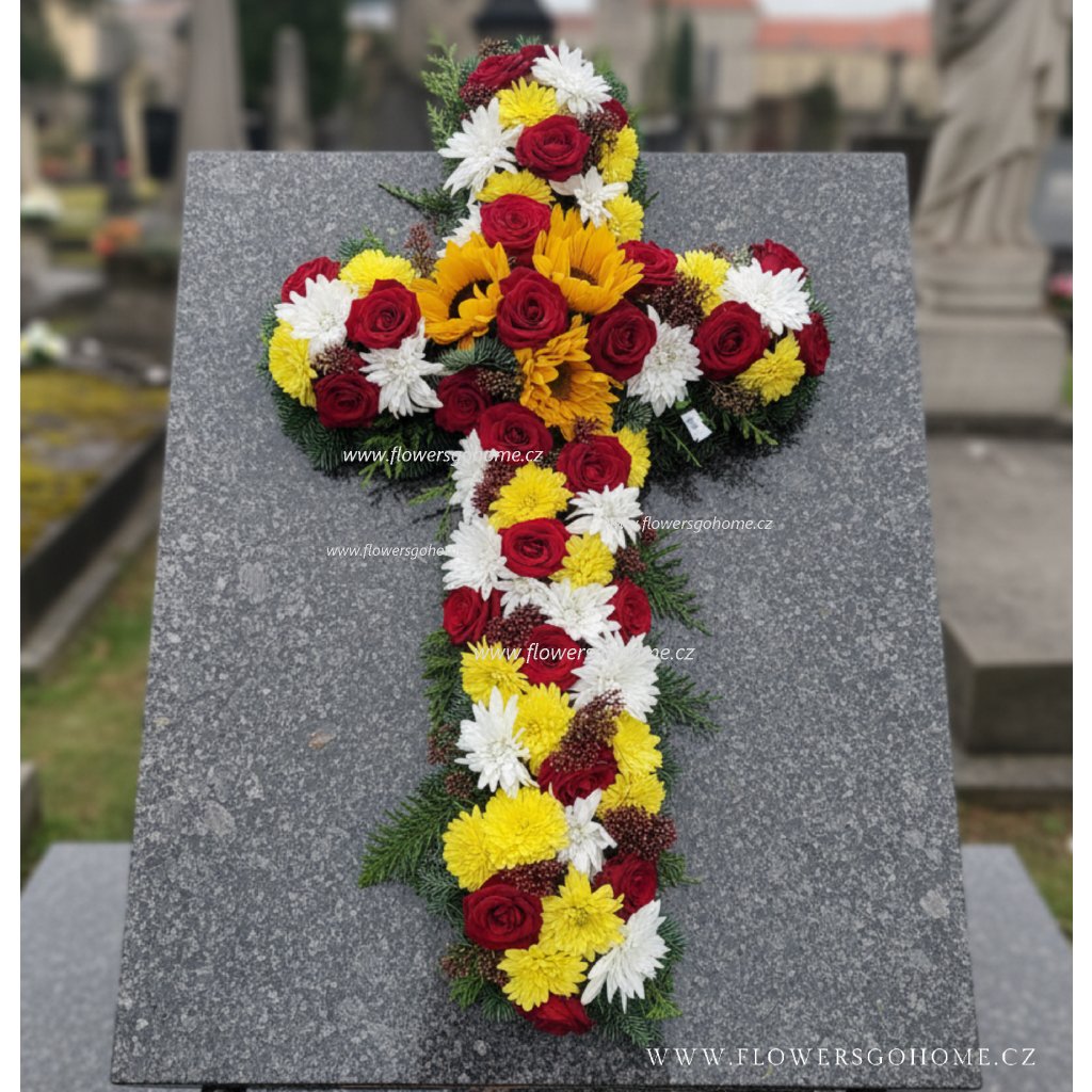Smuteční květinová dekorace ve tvaru křížku je vypichovaná do základu z mokré aranžovací hmoty. Dekorace je určena na položení (není vybavena opěrkou).