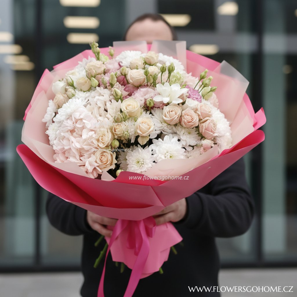"Pudrová Romance" je navržena tak, aby pohladila na duši. Není to jen kytice, je to náruč plná květin. Jemná hortenzie symbolizuje upřímnost a vděčnost, krémové trsové růže představují půvab a bílé chryzantémy dodávají nevinnost. Je ideální volbou k výročí, jako omluva, nebo jako dokonalý dárek k Valentýnu, který ženu zaručeně dojme.