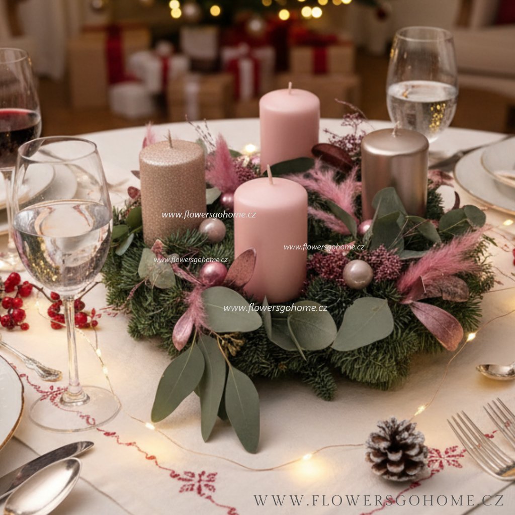 Elegantní adventní věnec s vrstvenou zelení a čtyřmi svíčkami v růžových odstínech - každá svíčka má jinou strukturu, což působí zajímavě. Kombinace jehličí s eukalyptem vytváří plný, slavnostní vzhled s jemnými akcenty. Každý kus je ručně vyráběný originál – ideální na sváteční stůl či komodu.
