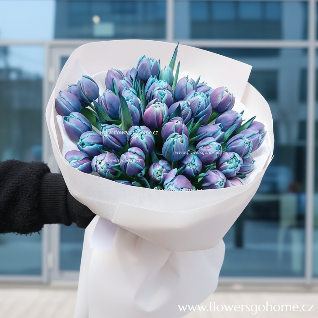 ✅ Fascinující barva – Odrůda Double Bubble vyniká specifickým probarvením. Tmavě modrá se mísí s fialovou a vytváří hloubku, kterou u jiných květin nenajdete. ✅ Plný "pivoňkový" květ – Nejde o obyčejné tulipány. Díky velkému množství okvětních lístků působí květy bohatě a po rozvinutí připomínají pivoňky. ✅ Minimalistický design – Kytici jsme zabalili do sněhově bílé voděodolné manžety. Tento "čistý" styl nechává maximálně vyniknout barvě květů.