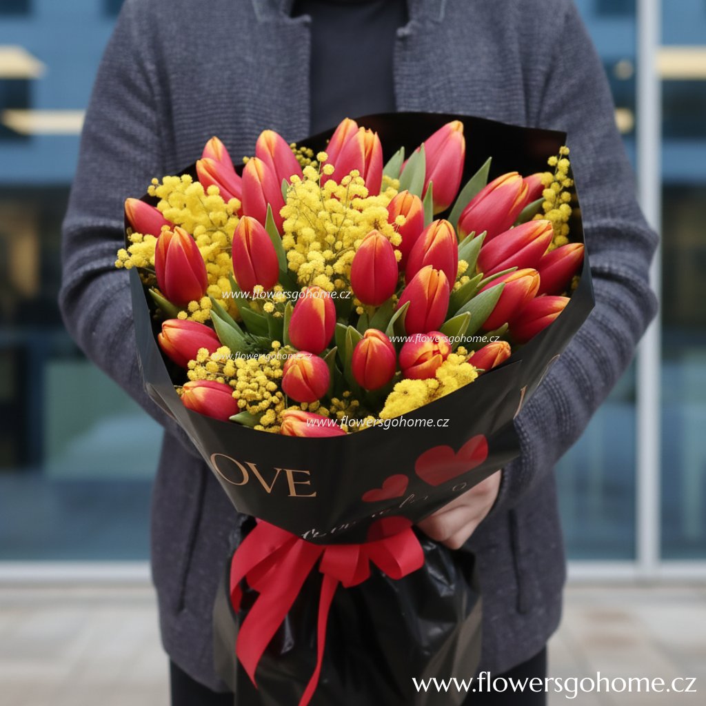 Dárek, který má šťávu. Pro ženu, která je vaším sluncem. Pokud hledáte kytici, která okamžitě zlepší náladu a rozzáří místnost, právě jste ji našli. Kombinace ohnivých oranžovo-červených tulipánů a zářivě žluté mimosy je vizuální bombou. Je to ideální volba pro muže, který chce darovat energii, radost a zároveň jasně vyjádřit své city díky stylovému balení s tématikou lásky.