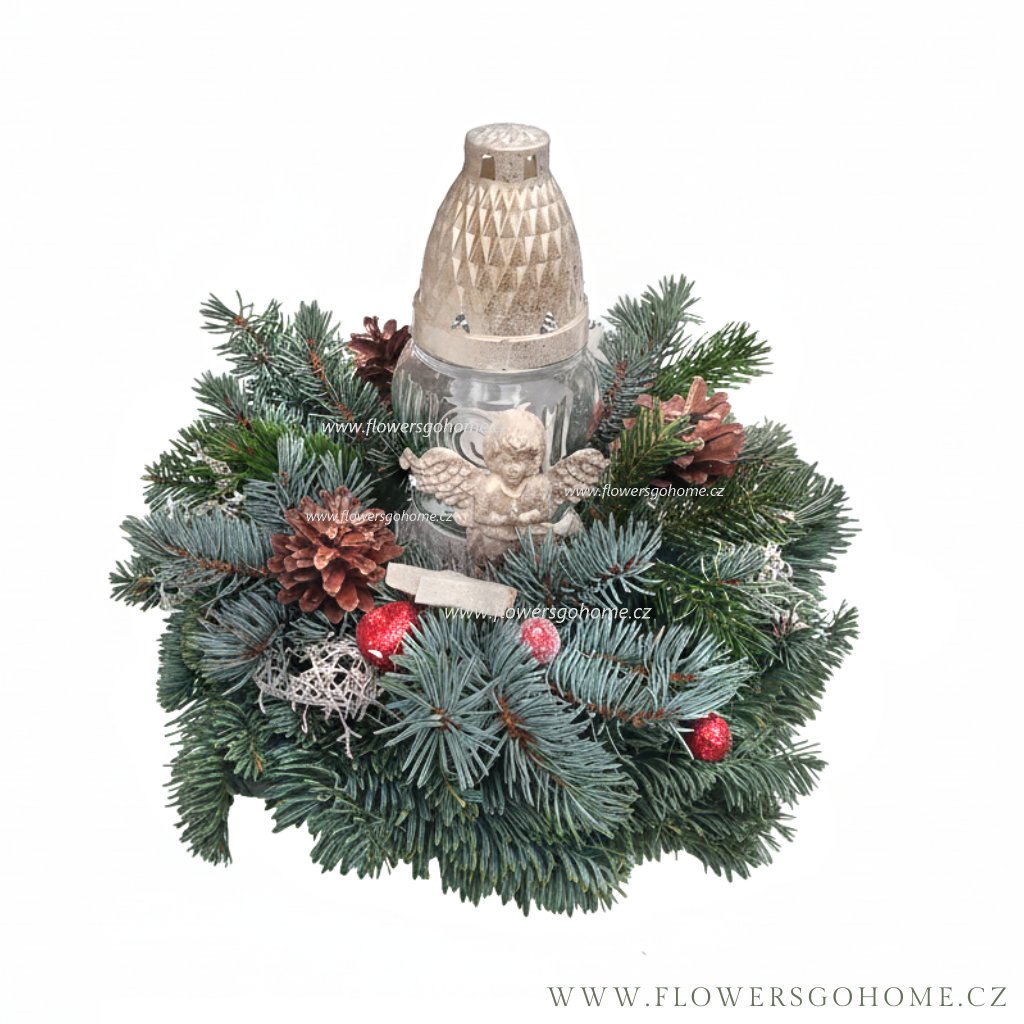 Vánoční dekorace na hrob na chvojovém základu se skleněnou svíčkou.