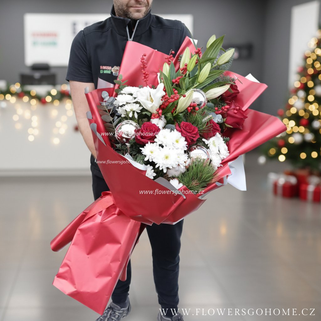 Dopřejte si opravdu výjimečnou vánoční dekoraci, která na sebe strhne veškerou pozornost. Tato velká sváteční kytice s cesmínou v sobě spojuje elegantní kombinaci bílých a červených květů, zimní zeleně a třpytu Vánoc. Kytice je navíc doplněná třemi skleněnými vánočními ozdobami (koulemi), které jí dodávají luxusní a slavnostní vzhled.